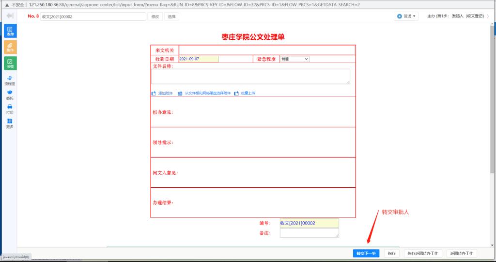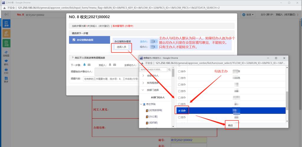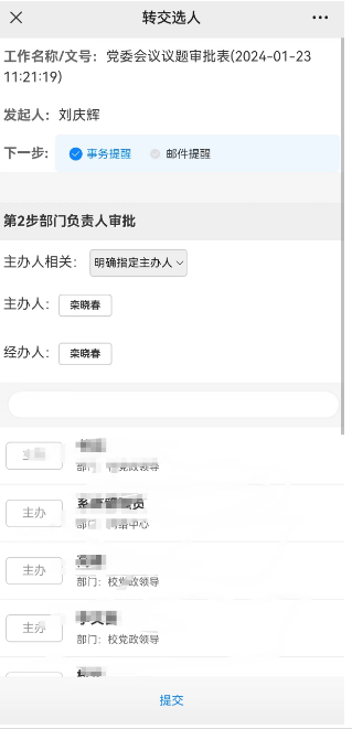 关于选人,大多数流程的主办人和经办人都已经选好,所以转交的时候会出现一键转交(即不选人直接到),确需要选人的时候,经办人栏目下方有一个方框,方框下方也有一些推荐人员,大多数时候所选人应在其中,若推荐人员中也没有,点击方框即可输入工号、姓名等方式进行检索。OA系统在使用过程中遇到任何问题,可以联系网络中心老师。