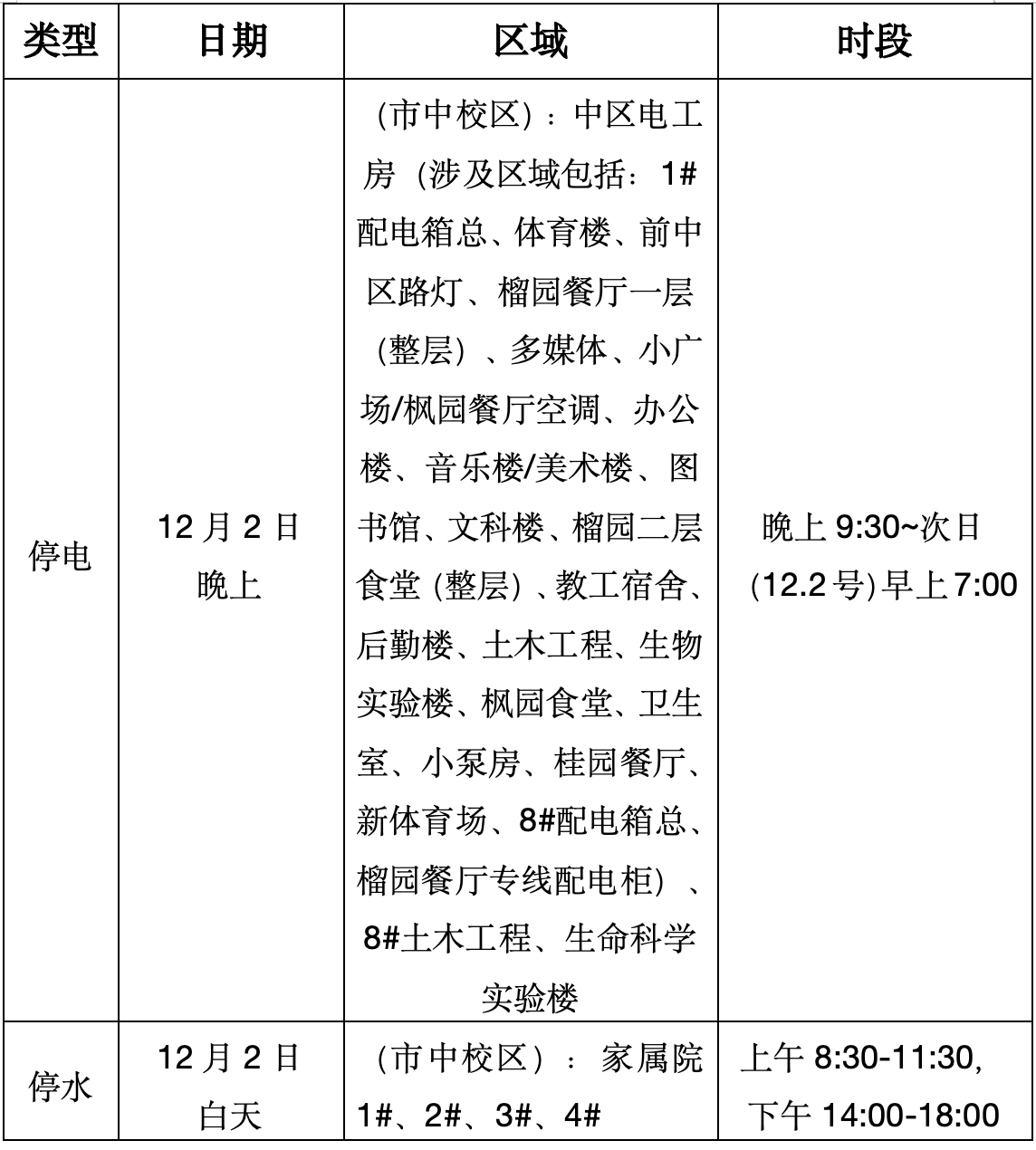 为提升水电管理水平,学校计划为市中校区和薛城校区安装智能水电表。目前该项目已完成招标、采购,现进入安装阶段。为将停水停电对教育教学、办公等活动的影响降到最低限度施工将分区域分时段进行。从11月28日起,后勤服务处将每天公布当日停水停电的具体区域和时段。请涉及的相关单位做好准备,提前通知到每位教职工,确保人员和设备安全,例如服务器、计算机、实验设备等做好备份,电梯和其它特种设备做好提前应对和管理。当日停水停电具体区域详见附件(每日更新,提前1天发布)。特殊情况联系电话15866247658。
