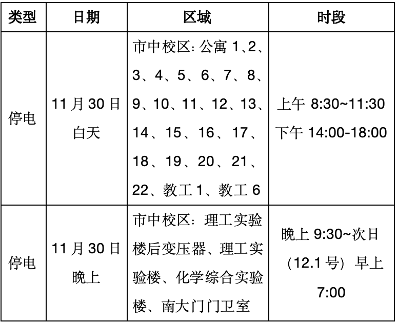 为提升水电管理水平,学校计划为市中校区和薛城校区安装智能水电表。目前该项目已完成招标、采购,现进入安装阶段。为将停水停电对教育教学、办公等活动的影响降到最低限度施工将分区域分时段进行。从11月28日起,后勤服务处将每天公布当日停水停电的具体区域和时段。请涉及的相关单位做好准备,提前通知到每位教职工,确保人员和设备安全,例如服务器、计算机、实验设备等做好备份,电梯和其它特种设备做好提前应对和管理。当日停水停电具体区域详见附件(每日更新,提前1天发布)。特殊情况联系电话15866247658。