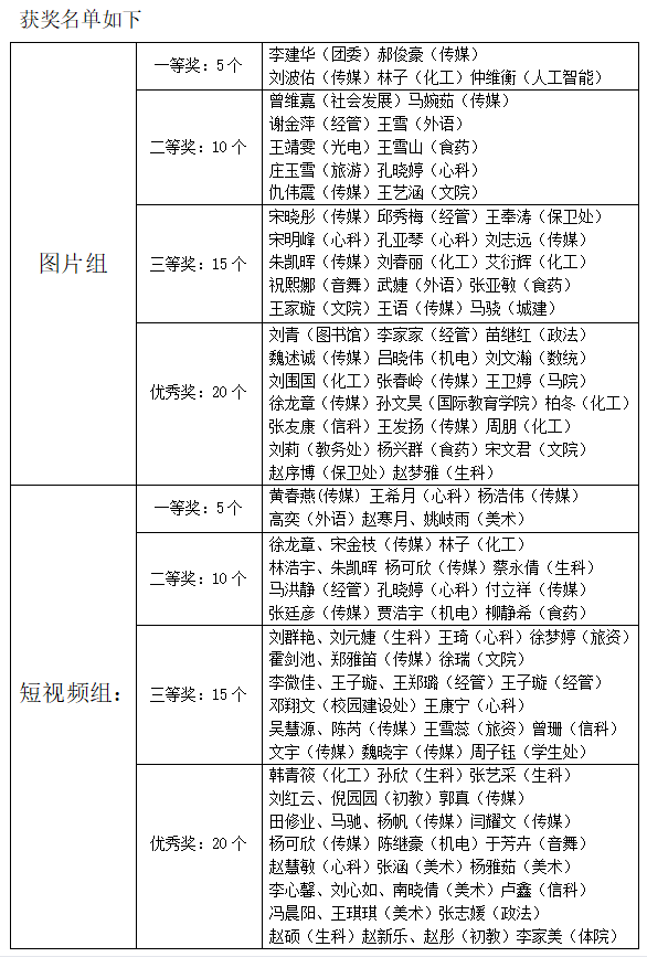 在经过参赛作品的严格评选后,本次比赛共评选出摄影作品组一等奖5名,二等奖10名,三等奖15名,优秀奖20名;短视频作品组一等奖5名,二等奖10名,三等奖15名,优秀奖20名。获奖作者将获得相关奖品和荣誉证书,请于规定时间按所在校区领取,领取时间5月20日,具体可以咨询相关老师。