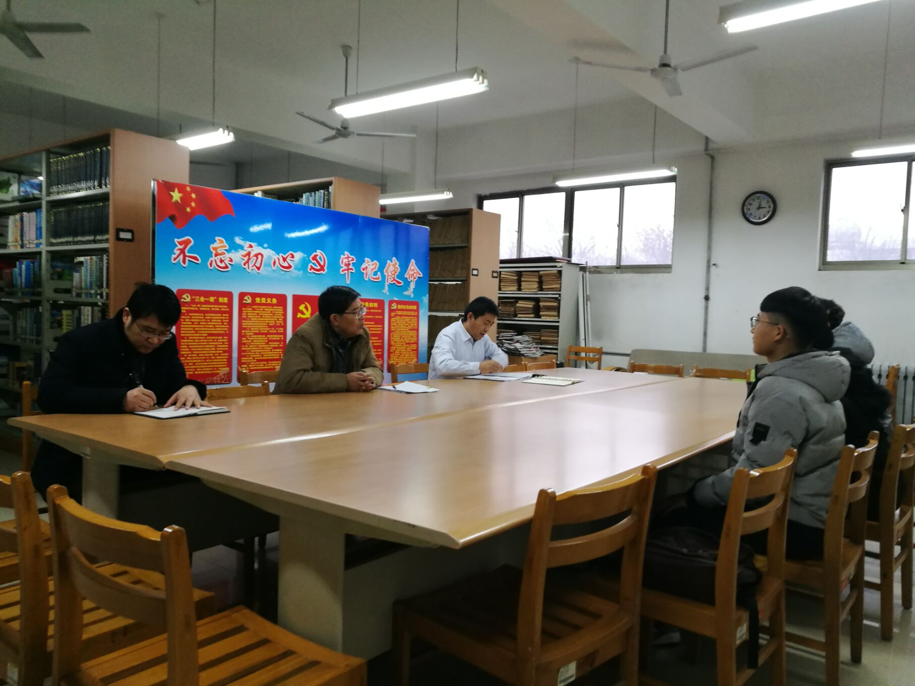 王洪凯对3名同学顺利回校表示热烈欢迎,并表扬作为第三批赴新疆支教的学生很好地传递了援疆支教的接力棒,圆满完成了支教任务,表现很出色。返校后,要充分把支教中的学习与收获转化为推动大学生能力全面发展上来,要尽快回归学生学习状态,准备好学业学习,同时大家已到大三,要着手考虑自己的毕业规划,谋划未来发展。王洪凯就学生在毕业论文和考研等方面存在的问题,热心向支教同学答疑解惑。