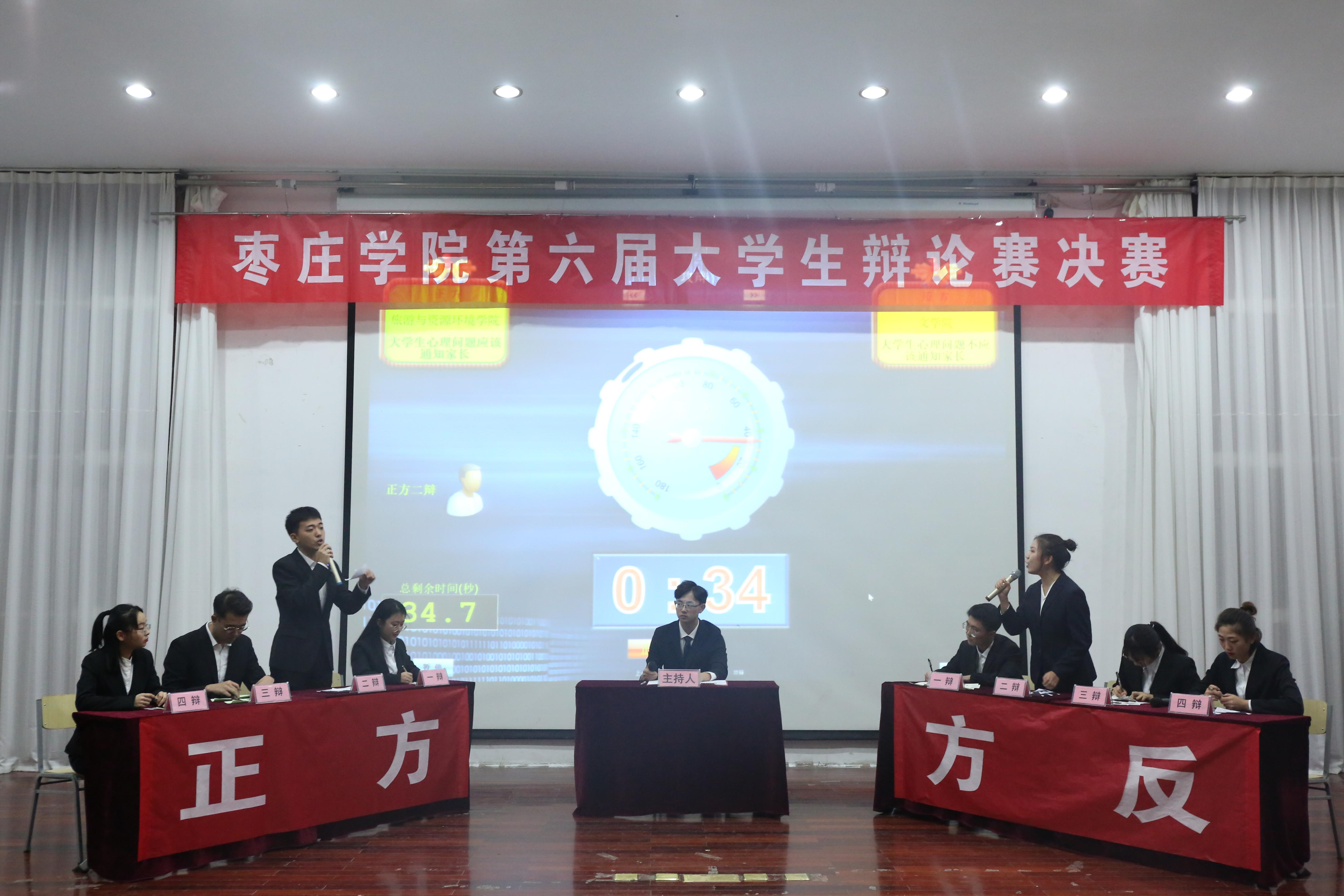 决赛分为上下两场,上半场比赛在传媒学院和光电工程学院之间进行。双方围绕“大学生成绩不良应不应该劝退”展开论辩,下半场是旅游与资源环境学院对战文学院,以“大学生心理问题是否应该通知家长”作为辩题展开辩论。双方辩手旁征博引、言辞犀利,引经据典、结合时事,现场掌声不断。最终文学院辩论队以总分第一的成绩摘得桂冠,传媒学院与旅游与资源环境学院获总分第二名和第三名,光电工程学院获总分第四名,旅游与资源环境学院辩手孙正获最佳辩手称号。至此,持续了近一个月的校级辩论赛落下了帷幕。