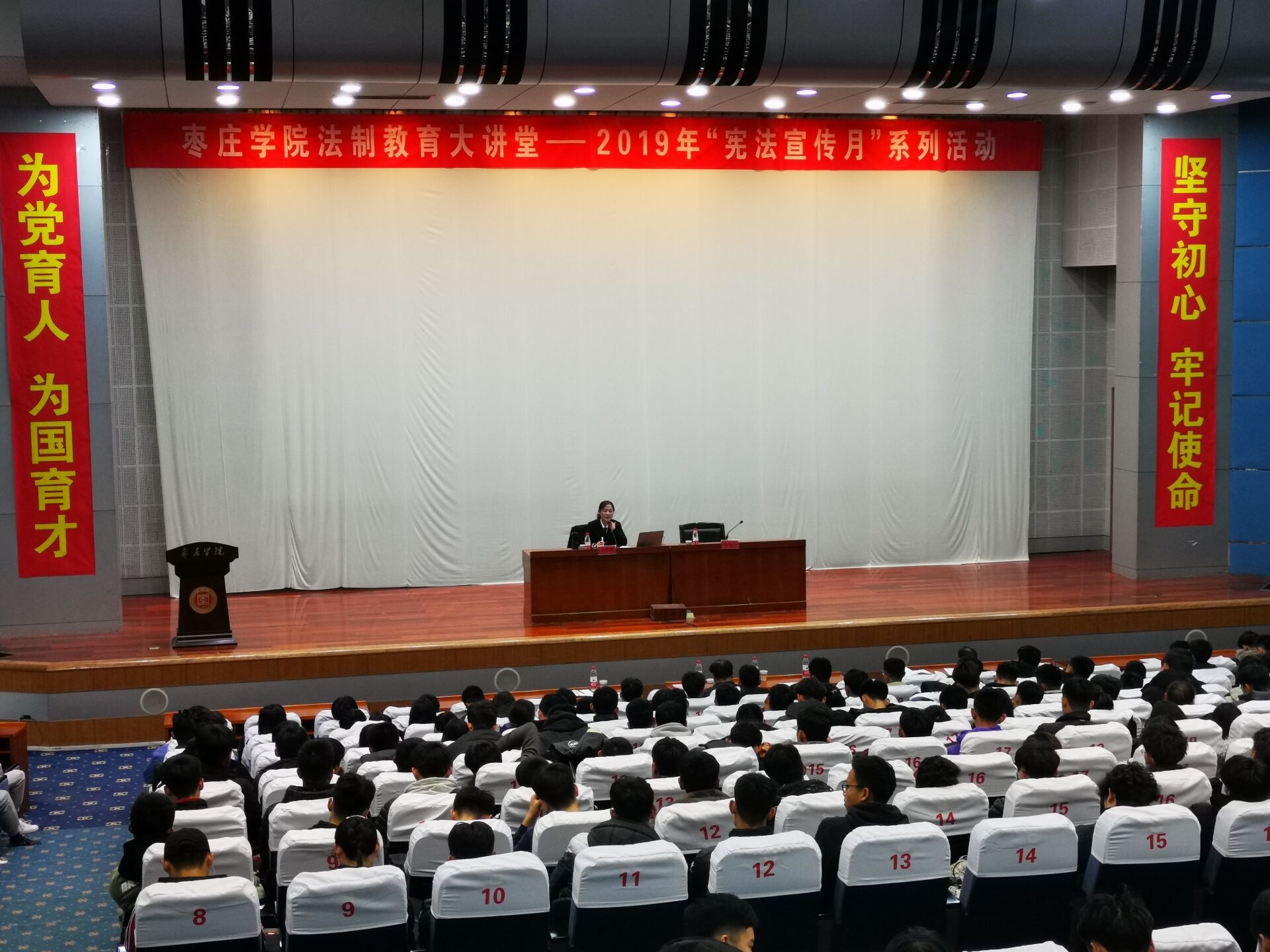 12月11日下午2点,由校宣传部主办、体育学院承办的法制教育大讲堂——2019年“宪法宣传月”系列活动讲座在综合楼报告厅举行,枣庄市中级人民法院未成年人案件综合审判庭庭长衣媛媛法官应邀主讲。体育学院副书记、副院长徐德刚,团总支书记、辅导员以及400余名大学生参加。讲座由徐德刚主持。