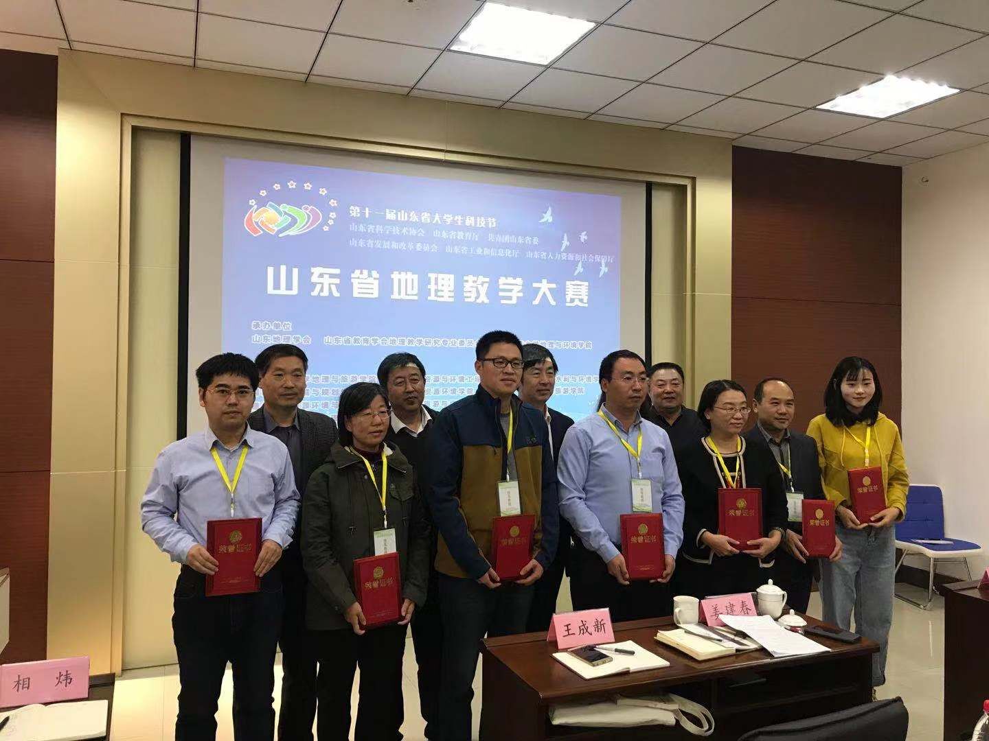 本次大赛由山东省科学技术协会、山东省教育厅、共青团山东省委、山东省发展和改革委员会、山东省工业和信息化厅、山东省人力资源和社会保障厅主办,旨在培养大学生的科学精神和创新能力,帮助大学生把握最新的教育理念和教学思想,具备地理学科核心素养和课程开发与实施水平。决赛共设高中教师组、初中教师组、本科组和研究生组四个组别。最终由郭文文老师指导的王淑贤同学获得本科生组特等奖;由彭远新、丁兆运老师分别指导的周康丽、郭晓娟二位同学分获本科生组二等奖。