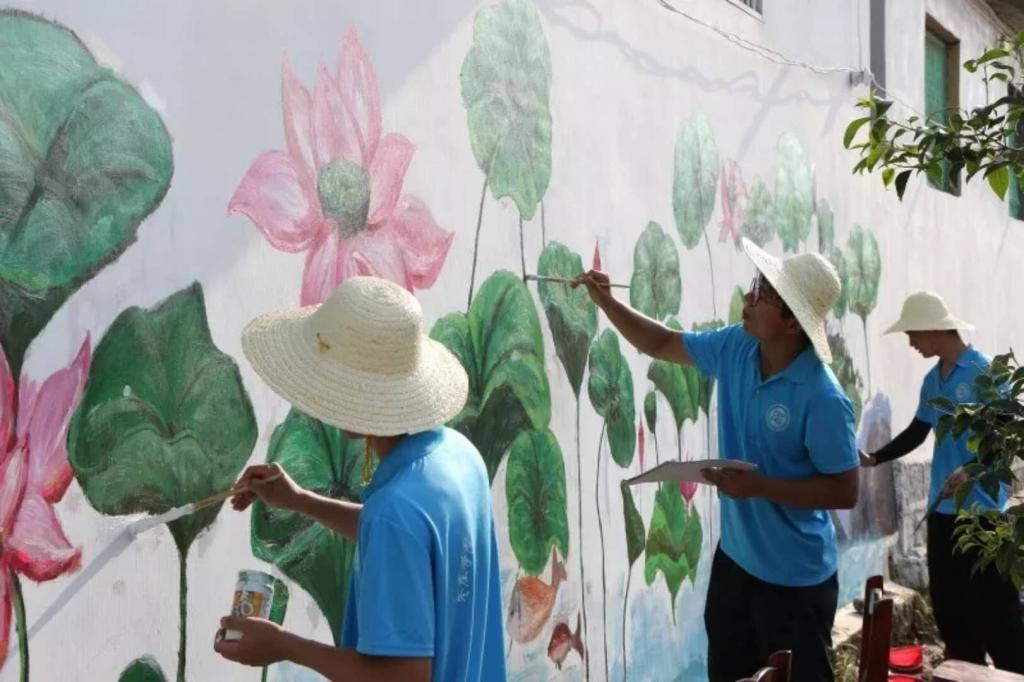经过前期调研,志愿者在带队老师的指导下,结合当地村居建设规划和实际建设情况,确定了“和满中华”“梅花图”“莲花图”等多个主题的墙绘内容。到达实践地点后,志愿者们根据工作安排,冒着炎炎烈日,各司其职,分工协作,构图、填色、修改各个环节有序进行,经过共同努力,多幅图案跃然墙上,墙绘内容受到了当地村民的一致认可与好评。活动后,志愿者们还分别针对各类不同墙绘内容和实际效果进行现场总结,探讨工作经验并交流实践心得体会。