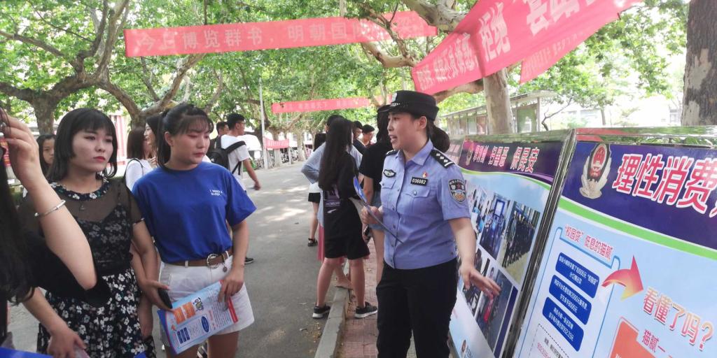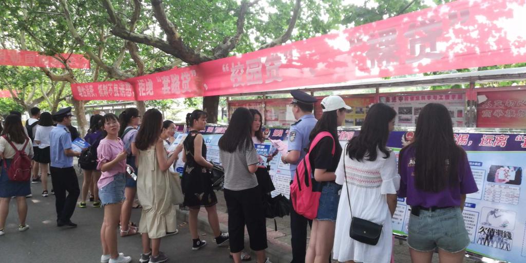 在小广场南活动现场,公安干警不顾炎热,悬挂活动横幅,摆放宣传展板,发放宣传资料。为抵制不良诱惑,拒绝各类陷阱,干警们向同学们详细介绍了“套路贷”的作案特征、“校园贷”低息的猫腻、“裸贷”的严重后果,提醒同学们树立正确的价值观,进一步提高防范意识,避免悲剧的发生。为深入推进打黑除恶专项斗争,严厉打击黑恶霸痞违法犯罪活动,民警们向同学们介绍了黑恶霸痞违法犯罪的形式,包括强迫交易、故意伤害、非法拘禁、敲诈勒索、故意毁坏财物、聚众斗殴、寻衅滋事、开设赌场、聚众扰乱社会秩序、聚众扰乱公共场所秩序、聚众扰乱交通秩序,以及其他妨害社会管理秩序等各类违法犯罪活动。鼓励大家踊跃举报黑恶霸痞违法犯罪线索,并留下了举报途径和举报方式(市级举报电话:0632-5078385、0632-110;市级举报邮箱:dhb_zz@163.com;市级举报邮寄地址:枣庄市公安局综合业务大楼[薛城区长白山路]刑侦支队三大队)。