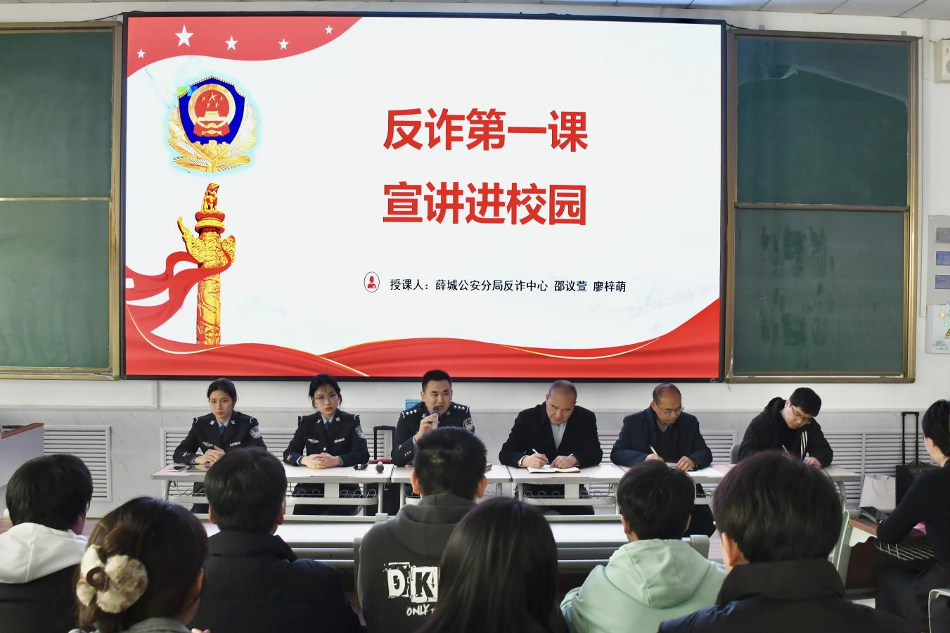 薛城区公安分局刑警大队副大队长胡乐飞警官和反诈专员邵议萱、廖梓萌以“防范电信网络诈骗”为题,为同学们带来了一场生动精彩的反诈宣传课。宣讲成员通过文字和视频生动形象地向同学们展示了电信诈骗的多发高发性和危害性,详细讲解了电信诈骗犯罪的四种高发案件类型以及典型案件的作案手法,为同学们提出了针对不同类型电信诈骗的防范建议。