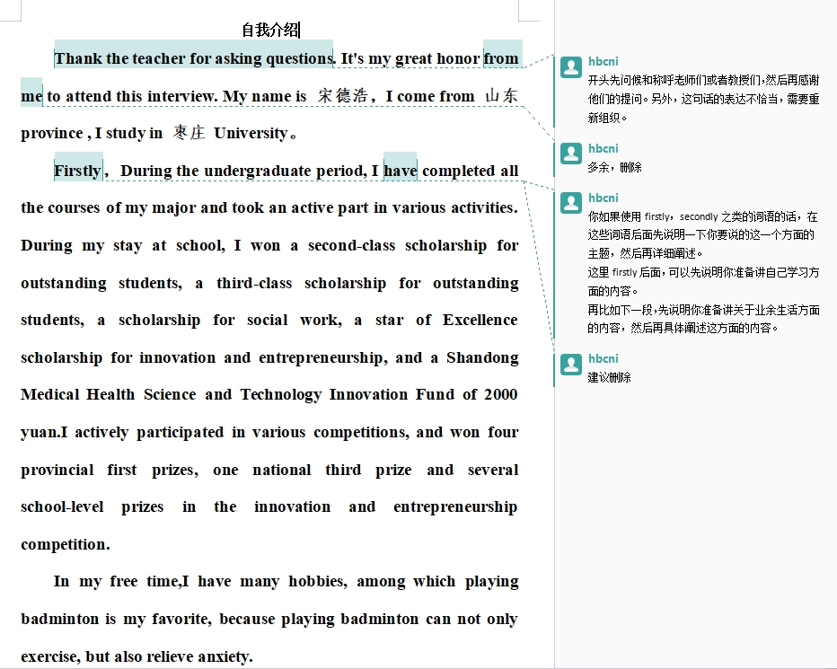 学院组织了全体专任教师为学生修改自我介绍、个人简历以及相关的专业知识问答(英语、日语、俄语)等。指导教师围绕语法知识点、表述规范性、行文流畅度、逻辑严密性等重要环节,对学生所提交的文字版复试材料进行了认真审阅、逐一修改,对学生复试外语环节提出了中肯建议。