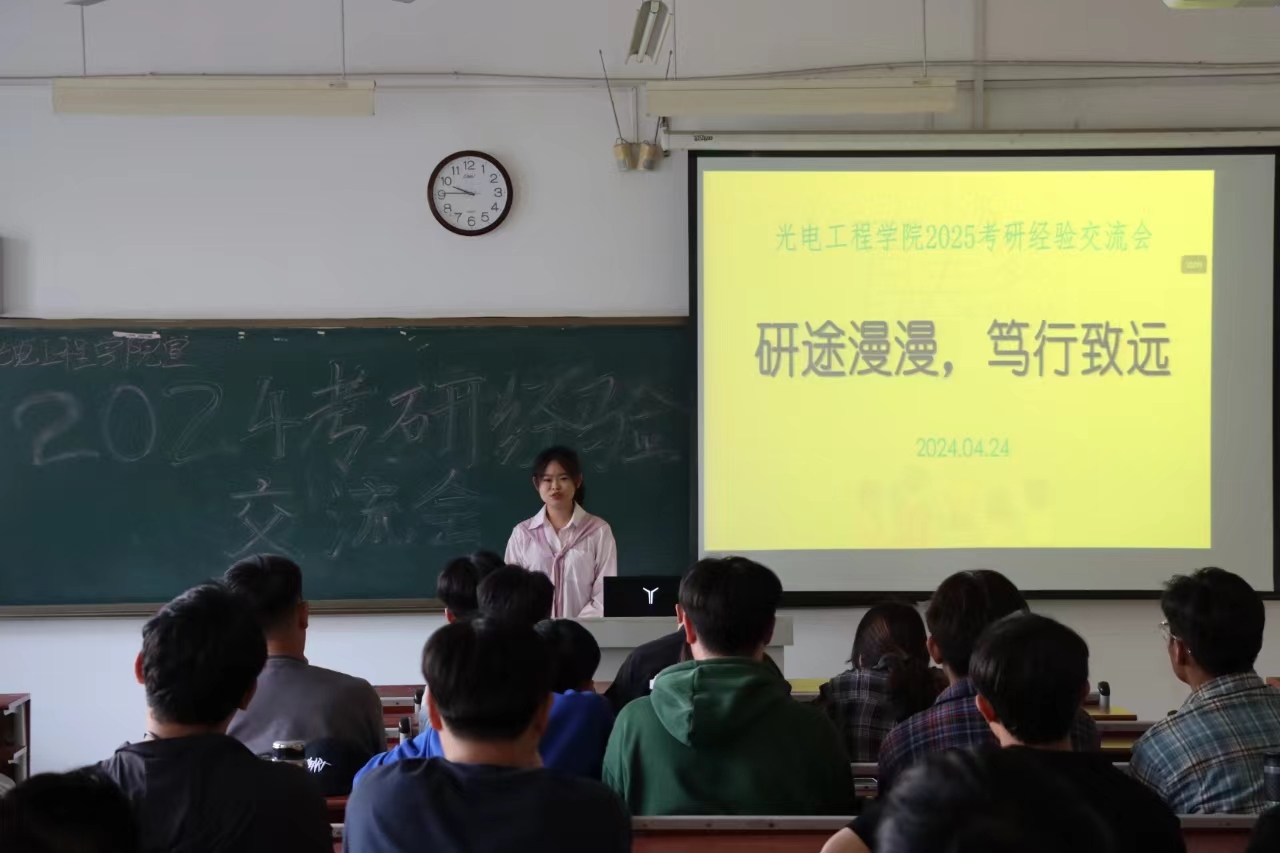 为进一步提升学生的考研积极性并营造良好的考研氛围,4月24日下午,光电工程学院在市中校区墨子楼S3301室举办“研途漫漫,笃行致远”考研经验分享会。本次活动邀请考研辅导教师王加迎、李振以及多位2024届考研成功上岸的优秀学生代表参加,吸引了学院2025届近百名学生参与。