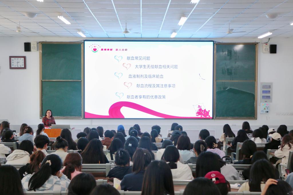 杜中然以《血液可以再生,生命不可重来》为题作了专题报告。报告中,杜中然围绕献血常见问题、血液制剂及临床输血、献血流程及其注意事项与相关政策支持做了详细解读。报告中设置游戏互动与答疑环节,学生们热情高涨,积极参与互动,现场氛围十分热烈。宣讲会在阵阵掌声中落下帷幕。