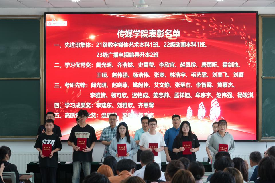 会议宣读了《关于表彰2023年度传媒学院学风建设先进集体和个人的决定》,对获得“学风建设先进集体”“学习优秀奖”“学习成果奖”“考研先锋”“高质量就业奖”的集体和个人进行了颁奖。