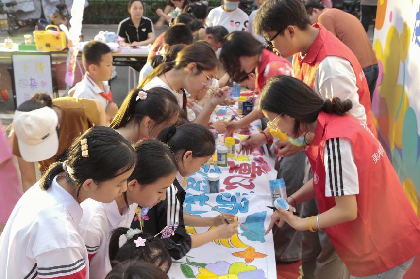 5月31日,美术与艺术设计学院联合兴仁街道举办“一起的力量”暨“‘爱’不闲置尽其用 ‘义’起行动助环保”庆六一公益集市活动。活动中,志愿者根据小朋友的面部特征,用植物颜料,为每个小朋友绘制了独一无二的面部彩绘,小朋友们在志愿者的带领下,用手中的画笔在巨大的绘画布上挥洒出绚丽的色彩,共同绘制出一副充满活力的纳斯卡巨画。最后,志愿者们带领小朋友一起进行非遗漆扇制作。