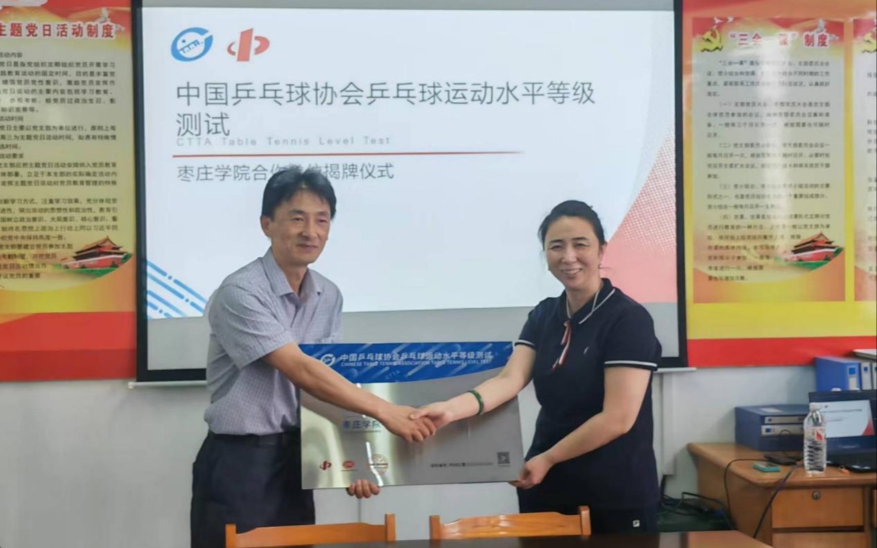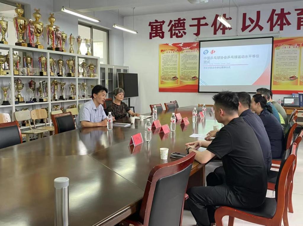 中国乒协等级测试专家委员会成员世界冠军沈燕飞、中国乒协等级测试山东运营中心主任陈俊书、中国乒协等级测试鲁南地区负责人巡考官张久和与体育学院党委书记高原、院长戴恩冰、教师代表等共同了参加本次合作仪式。