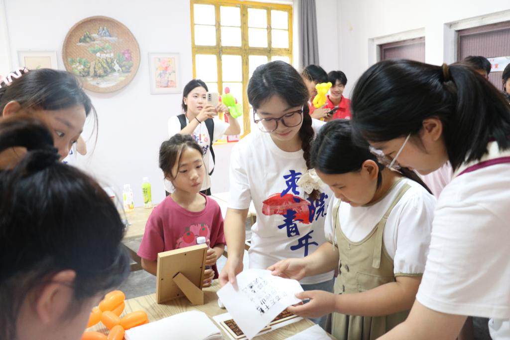 活动中,志愿服务队一行到“希望小屋”困境儿童家中进行了走访慰问,随后在三屯村委会开展了漆扇制作、造纸术、雕版拓印、绒花扭扭棒等非遗美育课程,并组织了普通话推广、儿童剧演出等志愿服务活动。