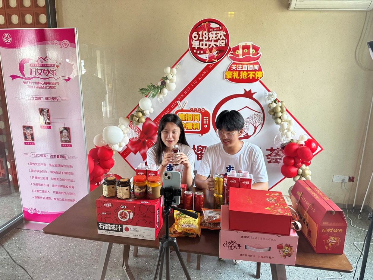 7月16日,实践团抵达薛城区沙沟镇张庄村开展石榴产业调研及电商宣传活动。张庄村曾获得全国生态文化村、乡村振兴培训基地等多项荣誉称号,以石榴种植闻名。实践团通过调研收集石榴种植、加工和销售环节的关键信息,深入了解当地石榴产业现状与发展潜力。在张庄村学生利用电商直播间进行宣传推广,提升石榴产品的知名度和销售渠道,帮助张庄村的石榴产品走向高端化和国际化。