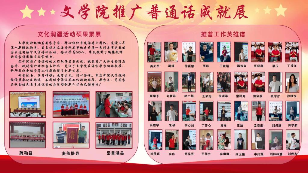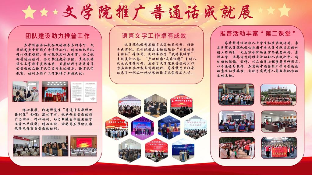 9月19日,文学院在学校语委会和教务处的指导下,成功举办推广普通话成就展。此次展览全面展示了文学院在语言文字工作方面取得的成就,特别是在推广普通话方面所做出的积极贡献。