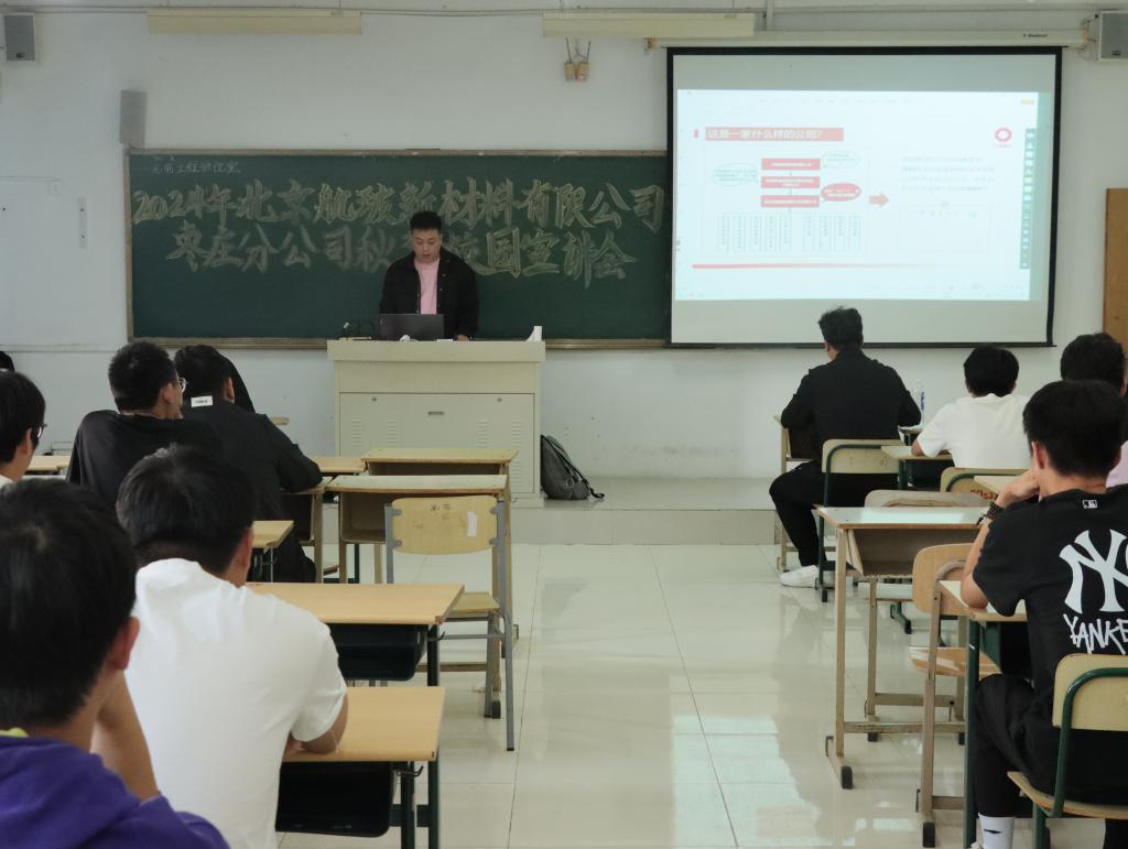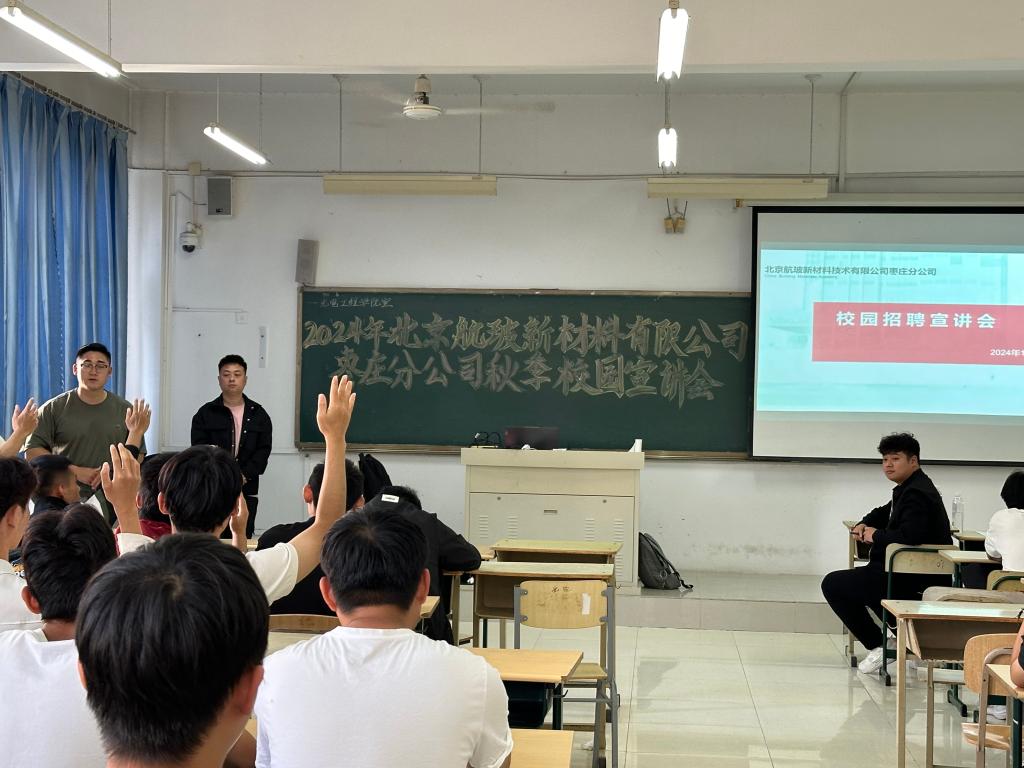 周鹏就北京航玻新材料有限公司枣庄分公司的企业背景、企业文化、行业现状及实习生职业发展、人才培养等方面为学生作了详细介绍,并对当前的就业前景和学生应掌握的基本技能作了分析。学生就在该公司就业的相关问题与周鹏进行了积极互动。周鹏对学生提出的专业对口、招聘职位、未来发展平台与机会等问题一一进行了解答。
