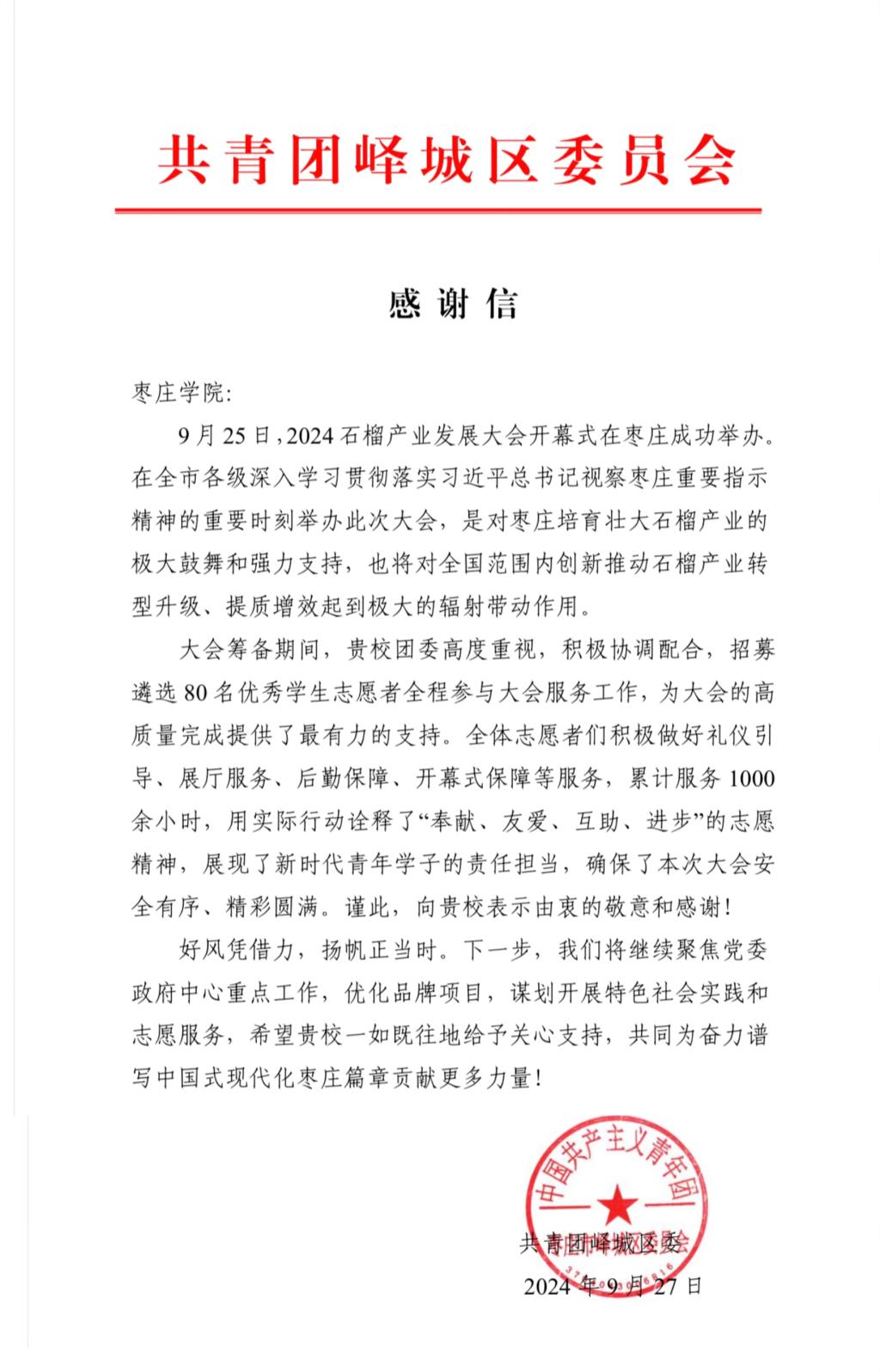 9月25日,由枣庄市人民政府主办、峄城区人民政府承办的“‘榴’助产业振兴 ‘枣’享红火生活”2024石榴产业发展大会成功举办。LETOU官网80余名青年志愿者在礼仪服务、场地引导、物品分发等各个岗位上,以专业的服务技能、热情的服务态度出色完成了本次志愿服务活动,成为了大会上一道靓丽的风景线。