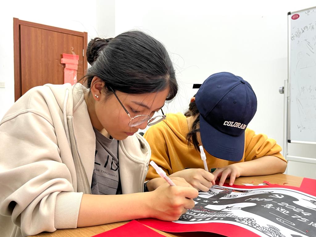 活动现场演示了漆扇制作的步骤,在大地书画协会志愿者的耐心指导下,同学们跃跃欲试,纷纷动手制作漆扇。同学们以漆为墨,以扇为卷,运用“飘漆”技法,以点、甩、弹、划等手法,一把把精美的漆扇逐渐成型,每一把漆扇都承载着他们对祖国深情的告白。此外,还进行了剪纸创作,民间手工艺协会的志愿者们带领同学们以剪代笔,以纸传情,一幅幅生动鲜活的图案跃然纸上,每一张剪纸都展现了对祖国浓厚的爱意。本次活动共制作了40件作品,其中漆扇作品有20件,剪纸作品有20件。