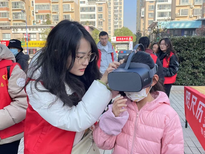 活动中,学院创新使用VR眼镜,给社区居民尤其是青少年和老年人带来一场新奇生动的爱国主义教育。活动现场,志愿者们耐心地向居民们介绍VR眼镜的功能和使用方法,并帮助居民们调试、佩戴好眼镜,引导居民体验VR眼镜。通过沉浸式虚拟体验,居民们身临其境,或置身于著名历史博物馆,或行走在硝烟弥漫的革命战场,或亲眼目睹先进军事装备,深刻感悟着爱国主义精神的具体要义。居民们纷纷向志愿者表达参与本次活动的感受,他们在感叹科技发展、VR技术带来真实体验的同时,也传达了自身对爱国主义精神的理解以及发扬、传承爱国主义精神的决心。