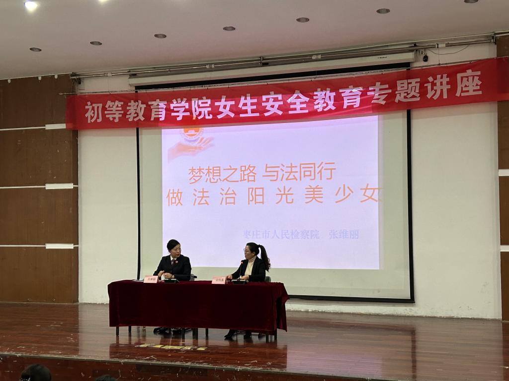 为进一步加强学生安全管理,增强学生安全教育的针对性和实效性,切实提高学生的安全意识和自我防护能力,在第十一个国家宪法日到来之际,初等教育学院在市中校区文科楼报告厅举办“梦想之路 与法同行”女生安全教育讲座,邀请枣庄市检察院第七检察部检察官张维丽作专题授课。