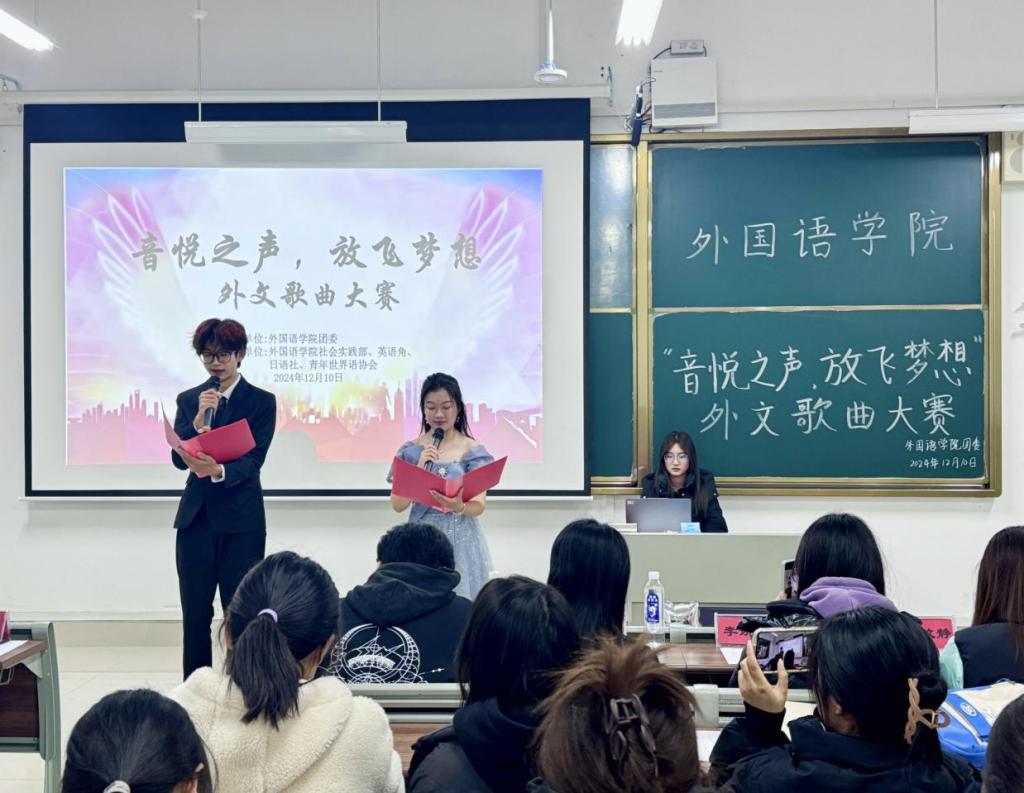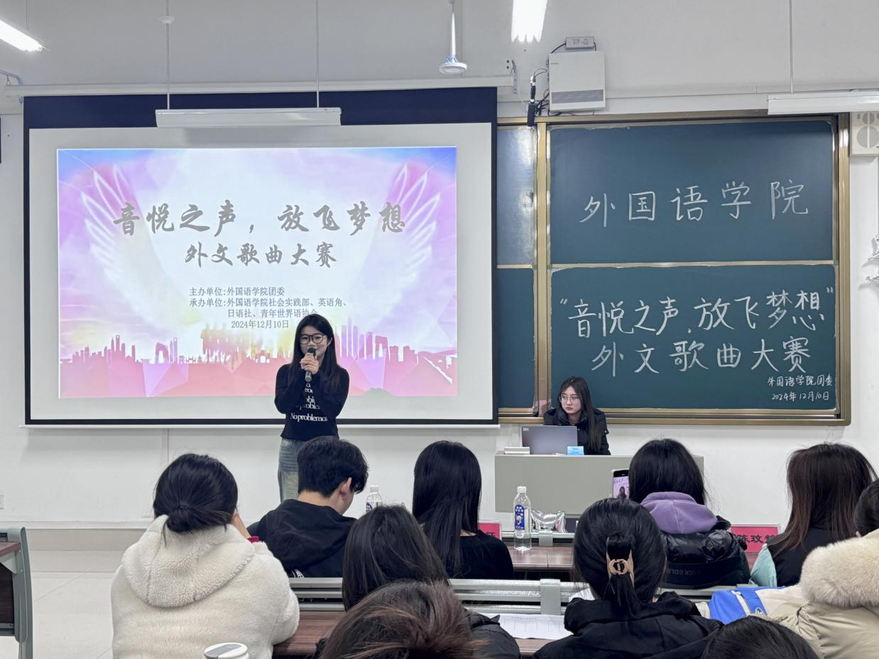 12月10日,外国语学院(大学英语教学部)在崇德楼4308教室举办“音悦之声,放飞梦想”外文歌曲大赛,此次活动作为国际交流周系列活动之一,旨在为进一步激发学生学习外语的热情、营造良好的外语学习氛围。