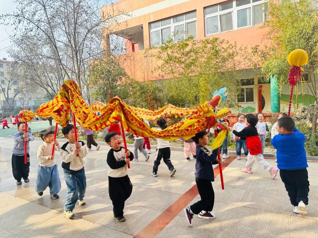 早上7点30分,志愿者们来到幼儿园门口给每位进园的小朋友点朱砂,手持朱砂启智笔,轻轻点在孩子们的额头中间,为他们开启智慧之门。志愿者和孩子们一起手持金鳞长龙腾跃穿梭,灵动的祥龙时而昂首摆尾、时而盘绕成福,以最炽热的姿态迎接萌娃归来。课堂上,志愿者们通过民间谚语、绘本故事、儿歌等多种形式向孩子们介绍了“二月二龙抬头”的来历和风俗习惯。