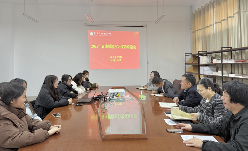 3月6日上午,马克思主义学院在薛城校区豁然楼A315会议室召开2025年春季援疆实习支教欢送会,学院党政领导班子、辅导员、援疆支教学生参加会议,院长董嫱嫱主持会议。