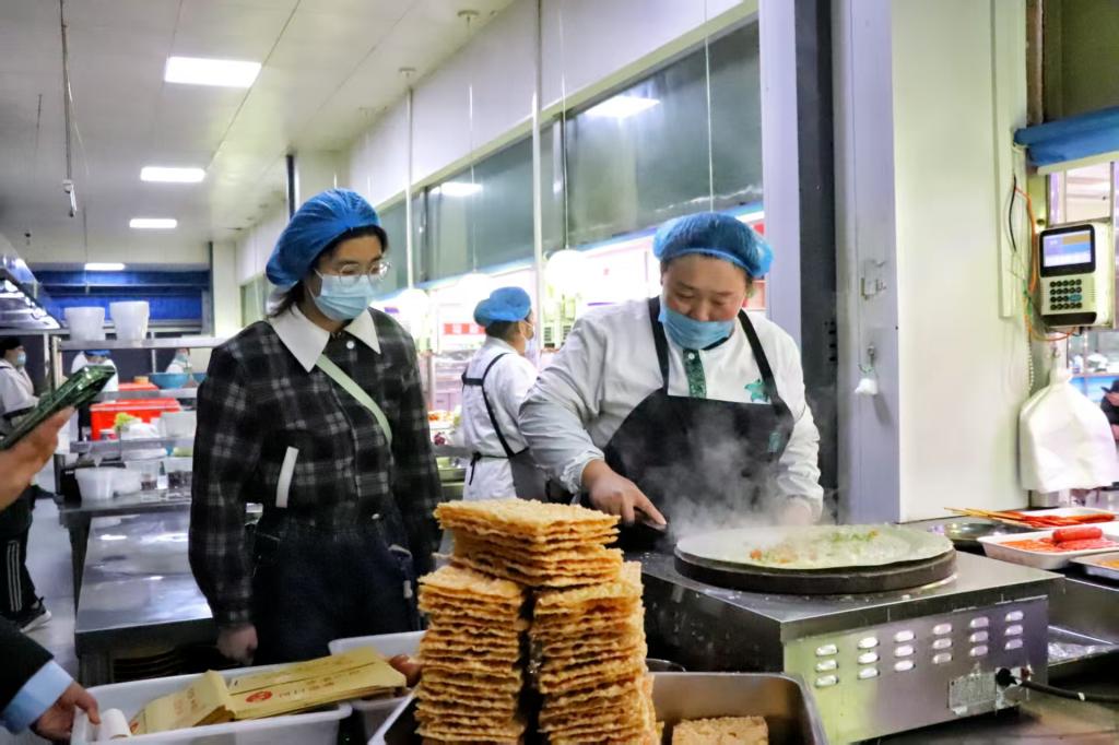 参观结束后,学生们开启了后厨生活一日体验。在食堂工作人员的悉心指导下,同学们系上围裙,跟着工作人员学习切菜、炒菜、制作煎饼馃子……从小心翼翼,到精准地添加各种配料,每一个环节都充满了惊喜。