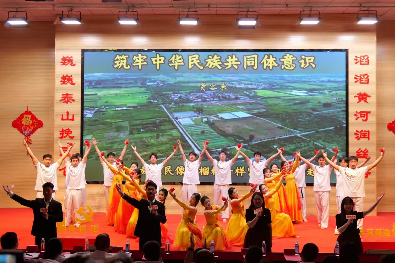 朗诵过后,一段优美生动的歌伴舞将现场气氛推向高潮。同学们用灵动的舞姿,展现着民族文化的魅力,象征着各民族之间如石榴籽般紧密相连。伴随着悠扬的歌声,传递出对这片土地的热爱,对民族团结的美好期许。