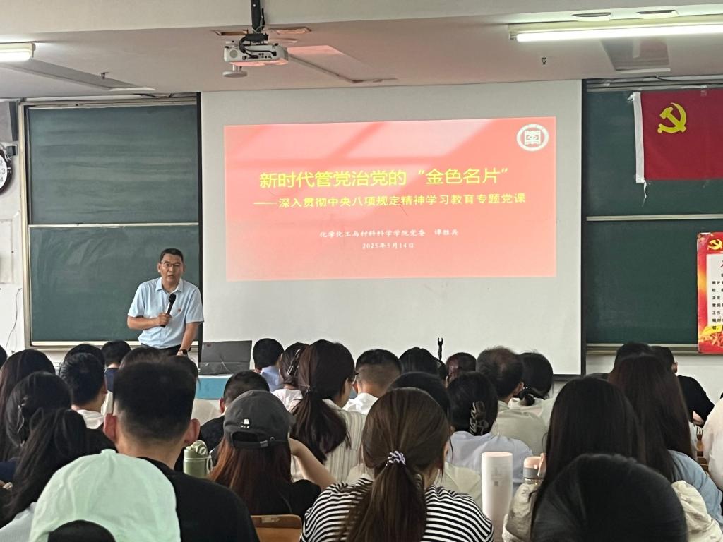 为推动深入贯彻中央八项规定精神学习教育走深走实,5月14日下午,化学化工与材料科学学院在市中校区综合楼1214教室举办深入贯彻中央八项规定精神学习教育专题党课,党课由党委书记谭胜兵主讲,学院全体党员参加党课。
