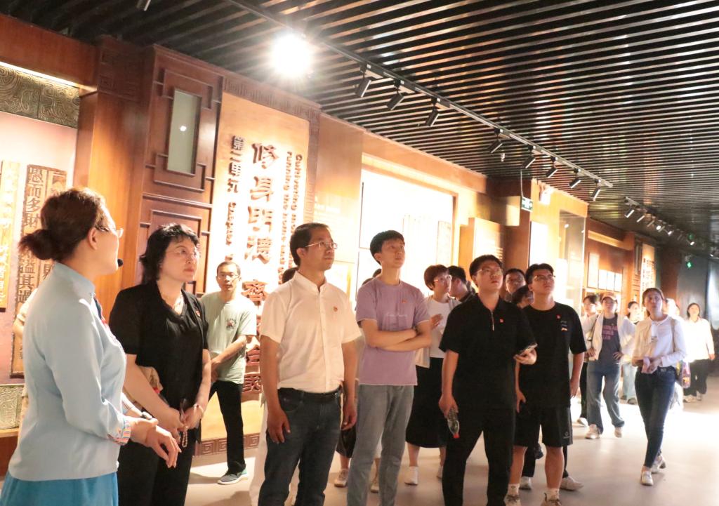 在讲解员的引领下,师生党员先后参观了院前大运河胜迹地刻、官箴家训,院内清风砖雕和大殿运河清风故事展厅,枣庄古代清官廉吏展馆以及古代惩贪制度和案例警示展区。展厅通过图文展板、多媒体互动等形式,让一个个廉政历史文化故事重现眼前,让党员们一览古今廉政楷模事迹,感受廉洁从政的传统美德,警示着党员们以史为镜,廉洁做人、廉洁做事。