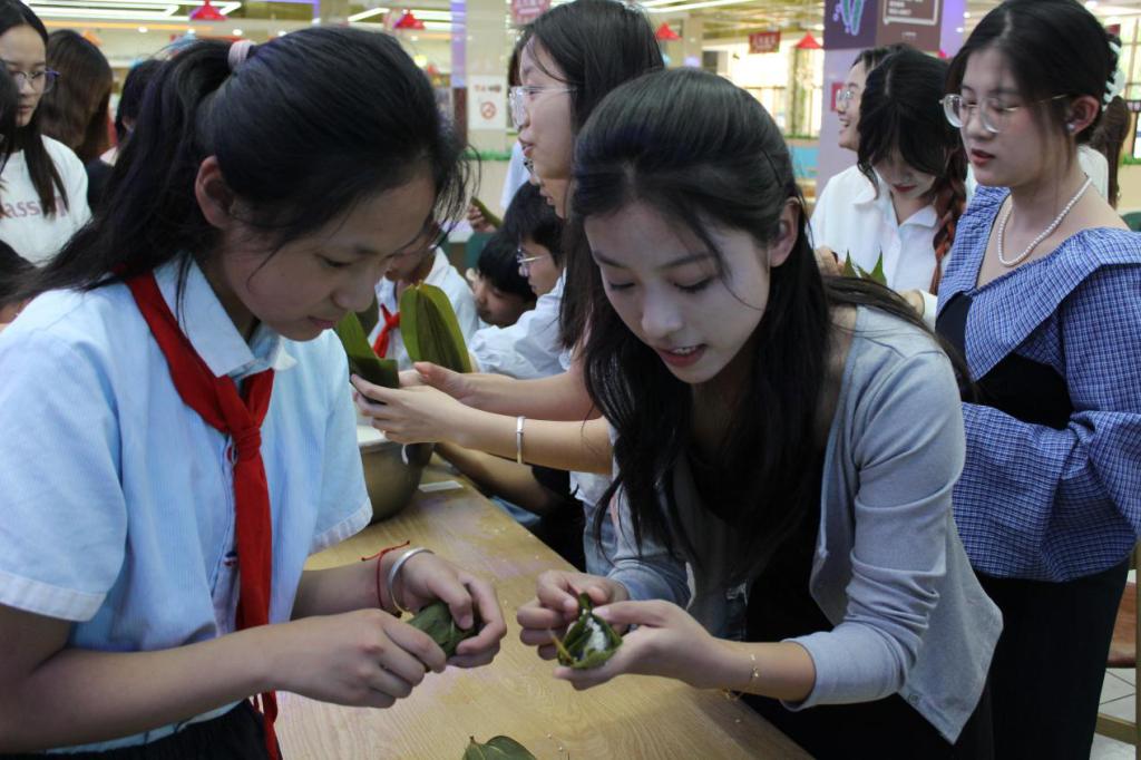 讲解过后,活动进入温馨的实践环节。大学生与小学生迅速结成“粽艺师徒小组”。大学生们俯身示范,耐心指导;小学生们兴趣盎然,学得有模有样。大手握着小手,传递着技艺与温情。现场欢声笑语不断,不一会儿,形态各异、充满童趣的粽子便摆满了餐桌,其乐融融的景象格外温暖。