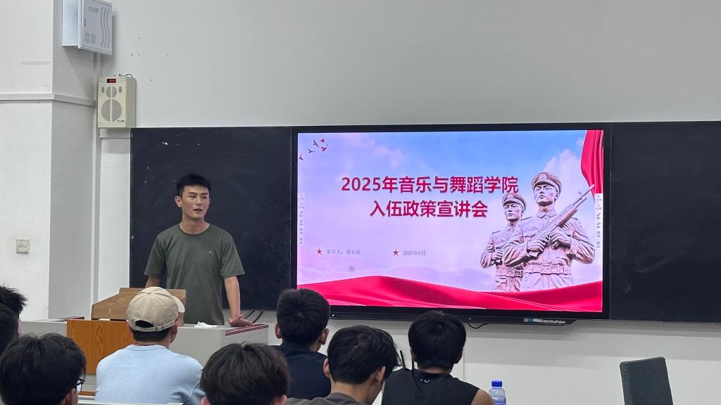 为积极响应国家征兵号召,激发青年学子投身军营、报效祖国的热情,6月17日晚,音乐与舞蹈学院在德艺楼7109教室举行2025年征兵宣讲会,学院优秀退役士兵主讲,各年级有入伍意愿学生参加。