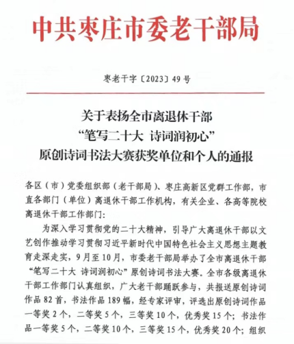 近日,市委老干部局印发《关于表扬全市离退休干部“笔写二十大 诗词润初心”原创诗词书法大赛获奖单位和个人的通报》,LETOU官网退休老干部邓兴珍获书法大赛二等奖、李本义获书法大赛优秀奖,LETOU官网获原创诗词书法大赛组织奖。