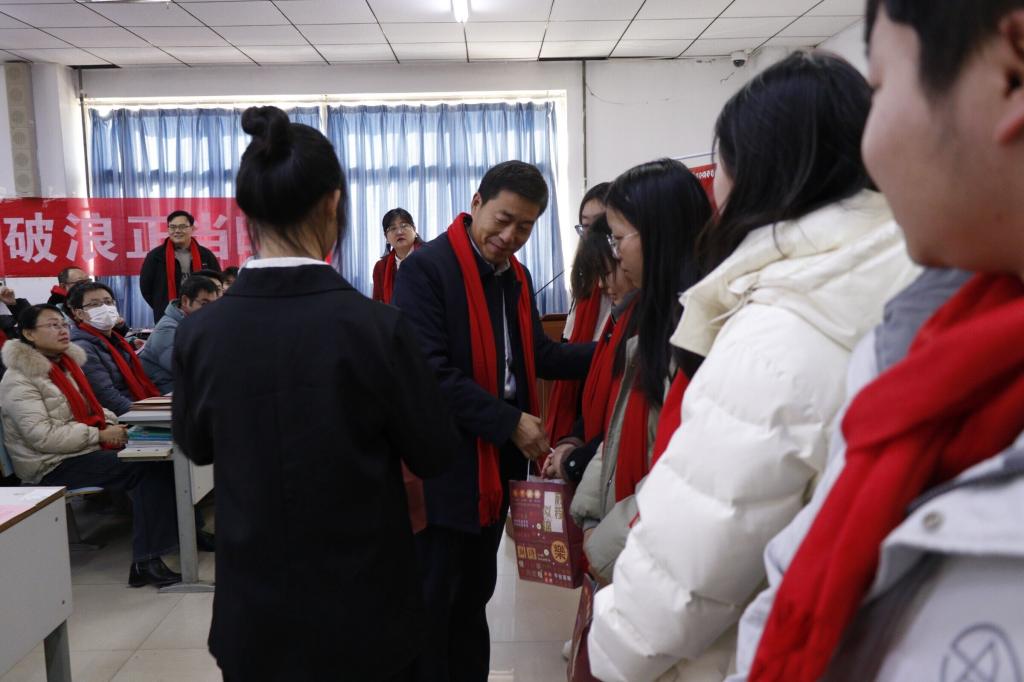 学院领导老师为考研学生分发考研“暖心加油大礼包”。现场气氛热烈而温馨,“薯”你最行、数你最“棒”、“包”你上岸、心想事“橙”……一件件充满寓意和希望的小礼品,一句句坚定温暖的祝福话语,为他们送去了冬日里的温暖关怀。全体考研学子进行宣誓,大家紧握右拳,以青春的名义郑重宣誓,坚守心中信念,全力以赴勇往无前。