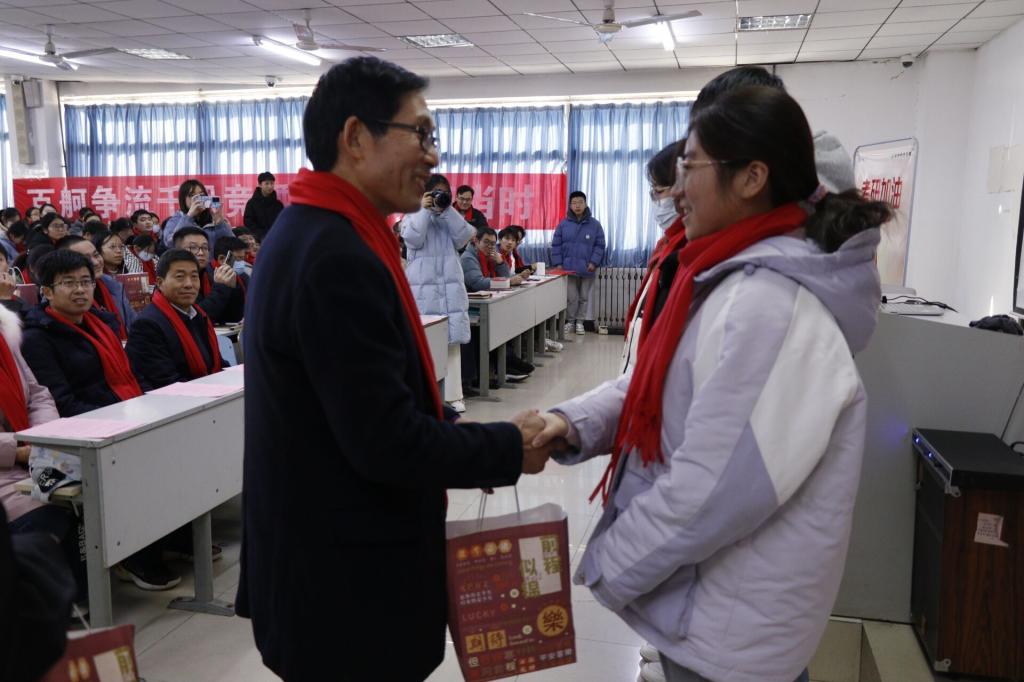 党总支书记郭传鑫作动员讲话,鼓励同学们要像前辈师哥师姐一样仰望星空,脚踏实地,努力拼搏,成为服务祖国、造福社会的科学家、学者、教授,预祝所有的同学都能考出让自己满意的好成绩!并对即将考研的学子提出三方面要求:一是要持之以恒,保持自信;二要敢于实践,追求成功;第三要涵养情怀,摆正心态。寄语同学们,要有“今日长缨在手、何时缚住苍龙”的一鼓作气精神、要有“不管风吹雨打、胜似闲庭信步”的从容精神、更要有“数风流人物、还看今朝”的豪迈之情。