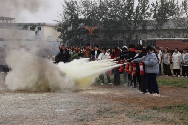 疏散演练结束后,保卫处工作人员为参演师生集中普及消防安全常识,讲解消防装备及常用消防器材使用方法,参演师生学习并体验了灭火器的使用方法,现场使用灭火器扑灭火情。