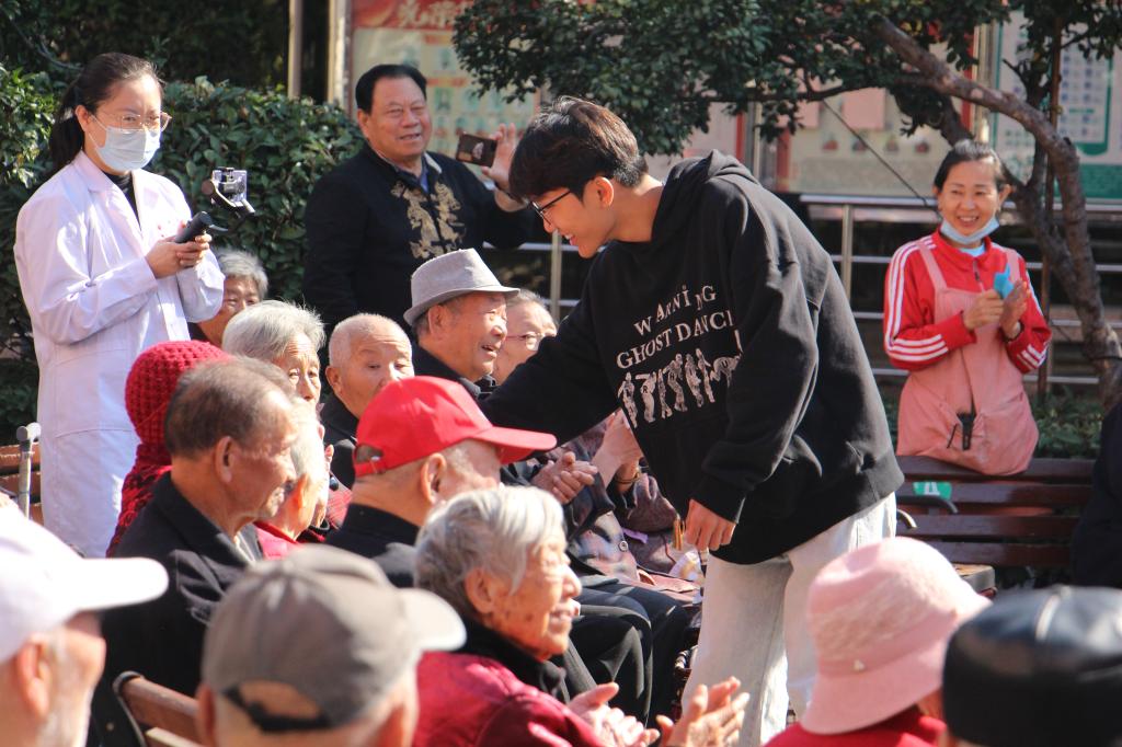 《你曾是少年》、《水手》、《老男孩》等歌曲带给老人青春的激扬,小品《报菜名》收获老人满场的喝彩,诗歌朗诵《岁岁重阳,今又重阳》向老人传达着满满的祝福,在《相亲相爱》的悠扬乐声中重阳节慰问活动结束。老人们幸福洋溢,带着大家一起唱起《没有共产党,就没有新中国》,将现场气氛拉向高潮。