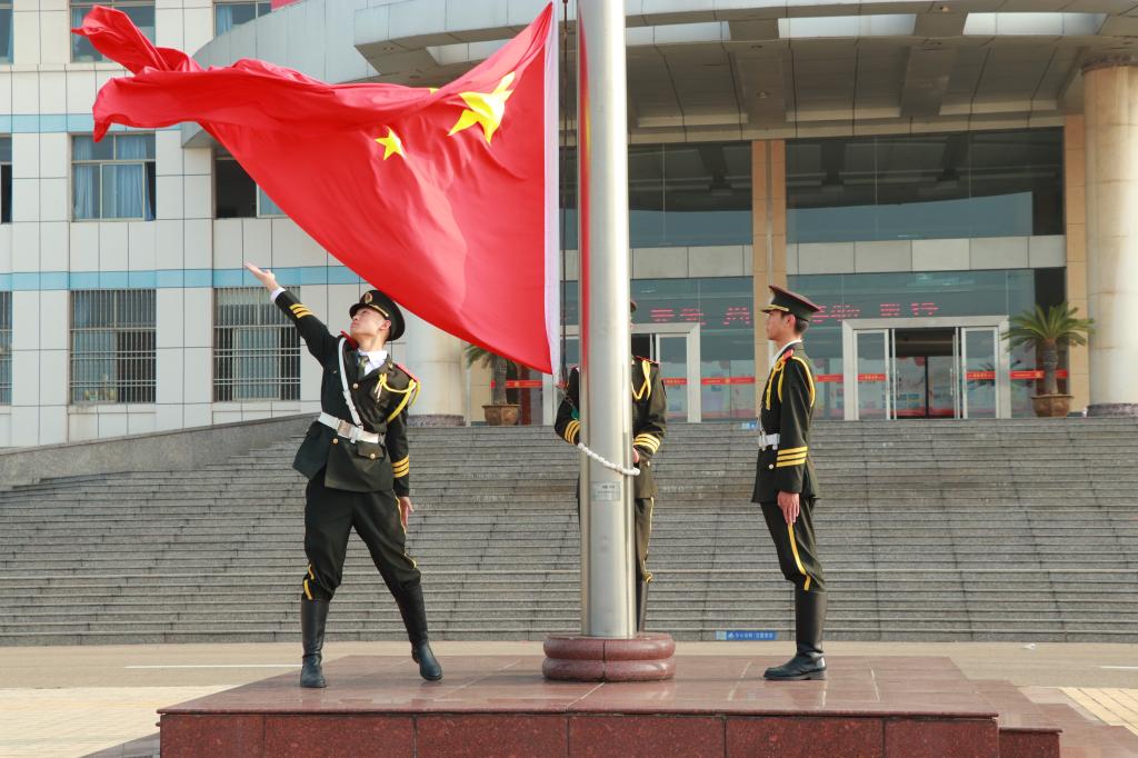 上午7时,升旗仪式正式开始,国旗护卫队迈着铿锵有力的步伐,护送五星红旗入场,迎着旭日的晨曦,伴随雄壮的国歌,在全体师生注目下,五星红旗冉冉升起、迎风飘扬。与会师生庄严肃立,面向国旗行注目礼,齐唱国歌,共同祝愿我们伟大的党青春永驻,伟大的祖国繁荣富强,伟大的人民幸福安康。