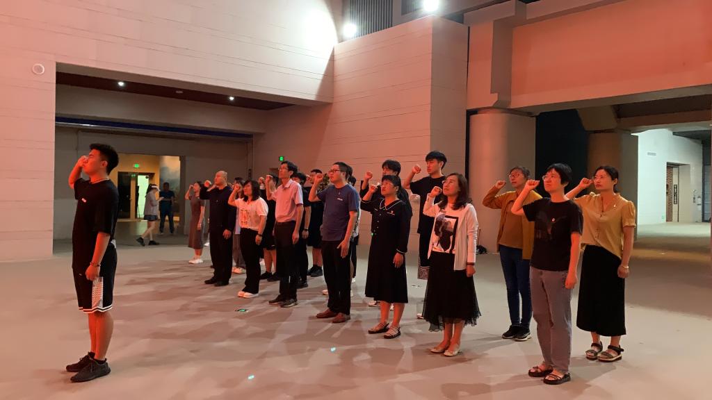 “西边的太阳快要落山了,微山湖上静悄悄,弹起我心爱的土琵琶……”在熟悉的旋律中,师生们通过一张张照片、一件件历史实物、一段段影像资料,与那段激情燃烧的革命岁月对话,重温了铁道游击队从创立初期到抗日战争胜利那段可歌可泣的、英雄悲壮的历史。随后,全体党员在纪念馆内,怀着无比崇敬的心情,举起右手庄严宣誓,重温入党誓词、不改党员初心,抒发对革命先辈们的崇敬之情。