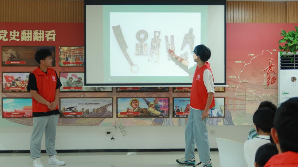 在课堂中,经管学子围绕“中国古代钱币发展的序列”和“从钱币文化看中华文明的连续性”两个部分进行讲述,介绍了中国货币发展的六个阶段,分别为贝币、春秋战国多种体系的货币、统一的半两钱制、汉至隋代的五铢钱制、唐至清代的宝文钱制和铜元,清晰地为呈现了中国古代钱币的发展简史。同时,志愿者们从货币与文明、货币文化起点、货币发展阶段之间的密切关联、货币名称、货币的书法文字及相关民俗等六个方面展开阐述,向孩子们讲解了货币文化如何体现中华文明。