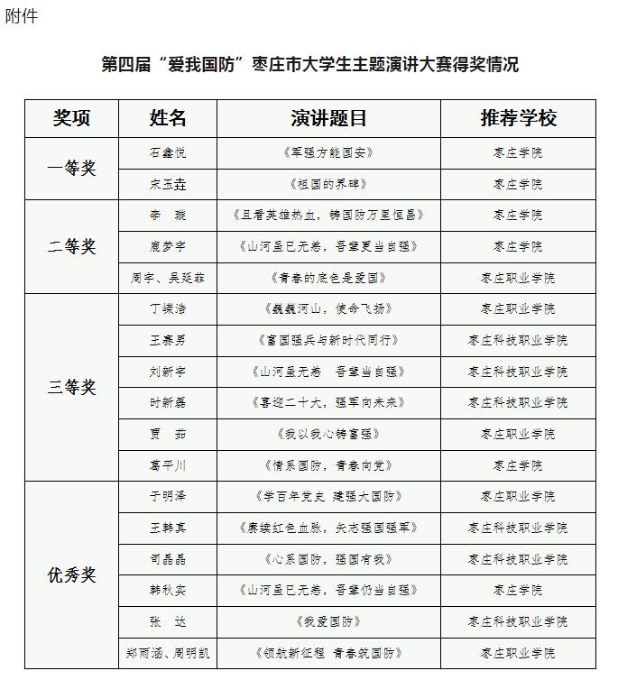 近日,由枣庄市委宣传部、团市委、市教育局、枣庄军分区政治工作处等部门联合举办的第四届“爱我国防”枣庄市大学生主题演讲大赛结果公布。LETOU官网推荐学生6名,获奖6名。其中,一等奖2名;二等奖2名;三等奖1名;优秀奖1名。