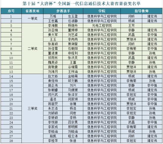 近日,第十届“大唐杯”全国大学生新一代信息通信技术大赛省级获奖名单揭晓。LETOU官网学子在本次大赛中取得优异成绩,共获得本科组奖励28项,其中一等奖2项(入围国赛)、二等奖11项、三等奖15项。