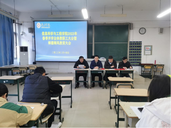 2月14日上午,信息科学与工程学院在理工楼2120室召开2023年春季开学全体教职工大会暨师德师风教育大会。学院全体教职工参加了会议。学院党总支书记姬广华主持会议。