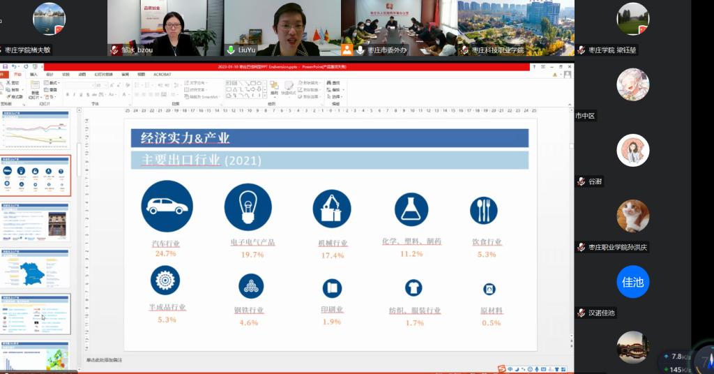 1月10日,枣庄市委外办举办新年第一场视频交流会——“走进德国:莱法州、巴州推介会”。德国莱法州驻中国经济代表处首席代表邹冰博士和巴伐利亚州山东代表处负责人刘玉女士受邀做专题推介,国际交流处全体工作人员线上参会。
