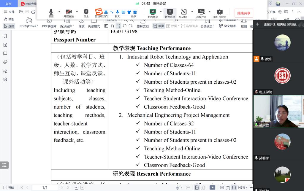 参加人员审阅、讨论了外籍教师工作自评表、学生评教成绩以及相关合作老师的反馈意见,对外籍教师本学期的表现进行评估。本次考评结果将反馈给每一位外籍教师,对表现良好的教师给与鼓励,对表现欠佳的教师进行督促整改。