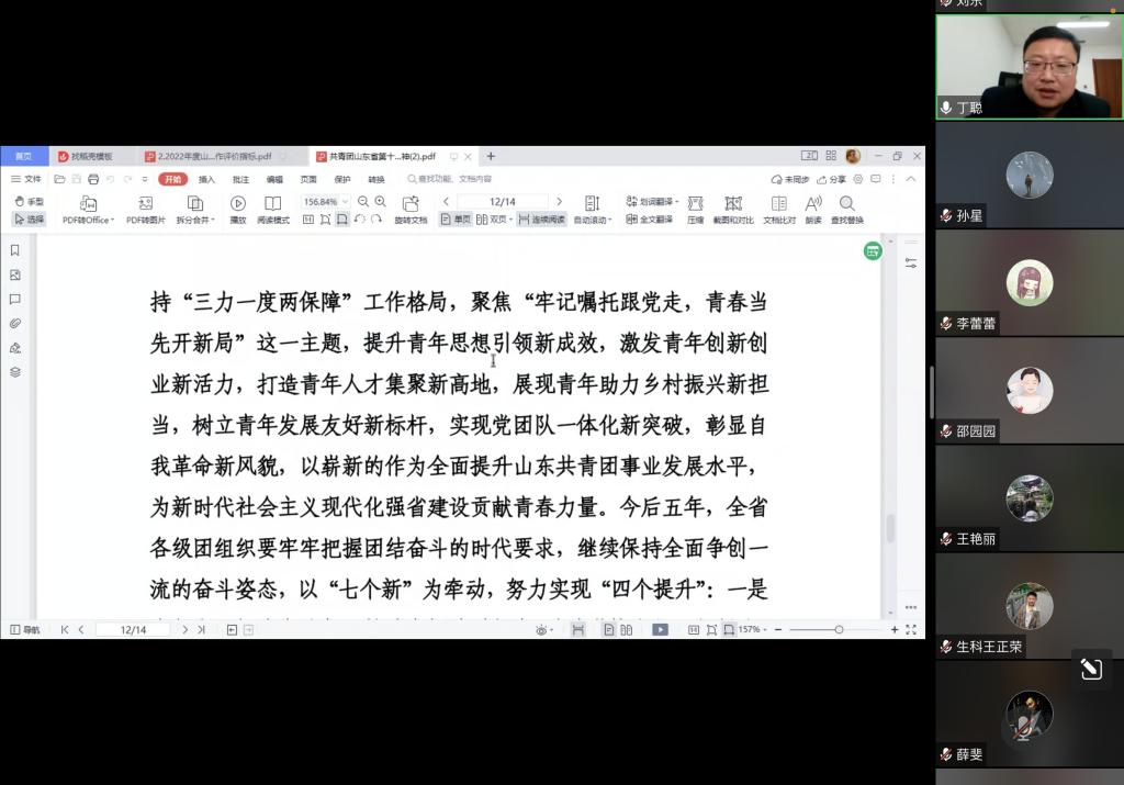 校团委书记丁聪领学了山东省委书记李干杰,共青团中央书记处第一书记贺军科在大会开幕式上的讲话精神,认真学习了团省委书记殷世逸代表共青团山东省第十四届委员会所作的工作报告。