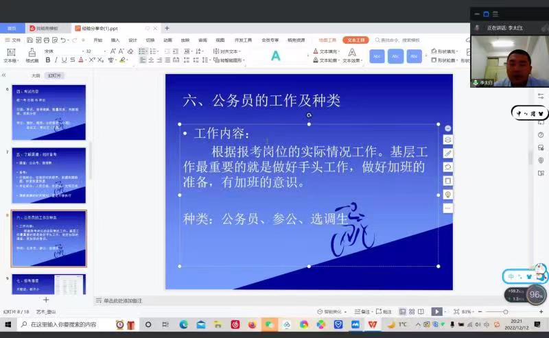 12月15日下午,文学院举办公务员及人才优选考试线上经验分享交流会,帮助学生进一步了解就业形势,加强就业分类指导。本次活动邀请了学院2022届优秀毕业生代表作为分享嘉宾,文学院部分毕业生线上聆听。