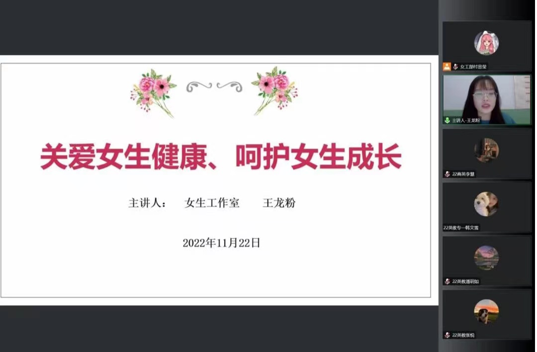 11月22日晚,外国语学院通过“腾讯会议”网络平台举办以“关爱女生健康,呵护女生成长”为主题的女生安全教育讲座,宣传女生青春健康知识,进一步提高女生自我保护能力。学院2022级全体女生参加此次讲座。